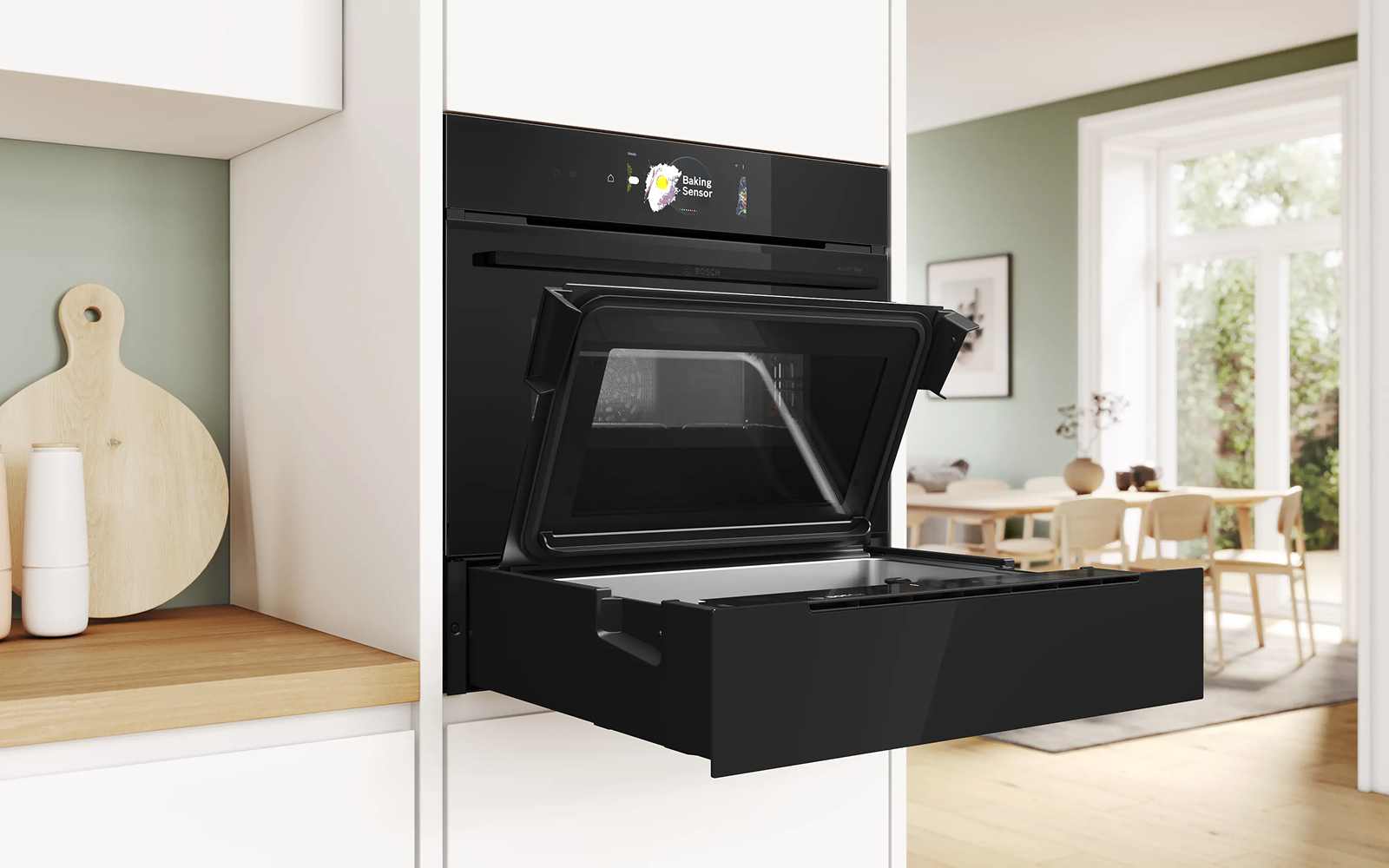 Az elmúlt időszak egyik legkézzelfoghatóbb újdonsága egy olyan formátum, ami konyhatervezési szempontból is új kapukat nyit. Ez a gőzfiók. A lényege egyszerű. A gőzös funkció bekerül egy alacsony beépítési magasságú fiókba, oda, ahol korábban sokszor melegentartó vagy tároló fiók volt. Így a gőzölés nem külön nagy készülékként jelenik meg, hanem a konyha természetes részeként, gyorsan elérhetően.