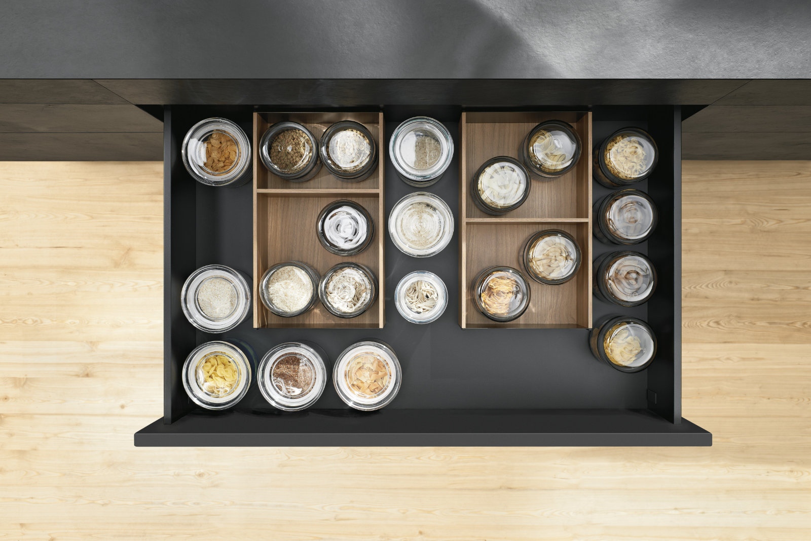 A mágneses és csúszásgátlós AMBIA-LINE belső rendszerező egy mozdulattal átrendezhető, így az evőeszközök, fedők, fűszerek vagy fóliák mindig logikus struktúrában maradnak. A fiók belseje nem rejtett tér többé, hanem a konyha tudatosan megtervezett része.