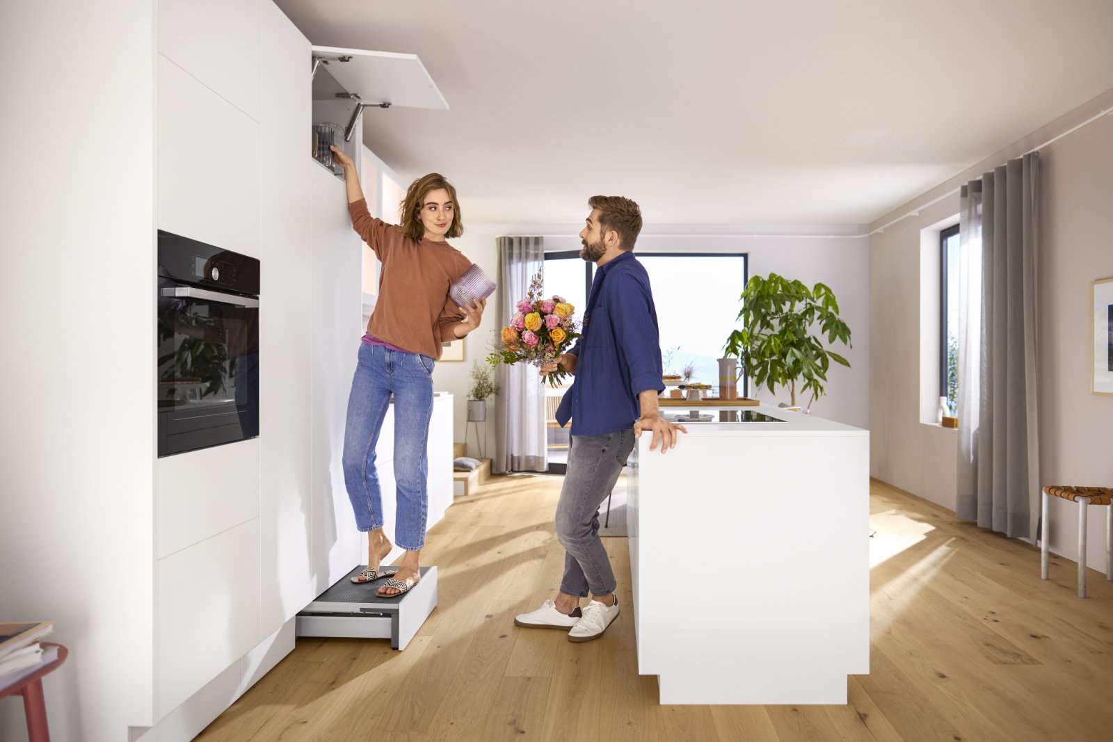 Már nyolc kilogramm terhelésnél stabilan lenyílik és reteszel, a BLUMOTION a finom záródásról gondoskodik, a SERVO-DRIVE pedig megkönnyíti a nyitást. Különösen kis lakásokban értékes, mert felfelé bővíti a tárolási lehetőségeket anélkül, hogy plusz bútorra lenne szükség.