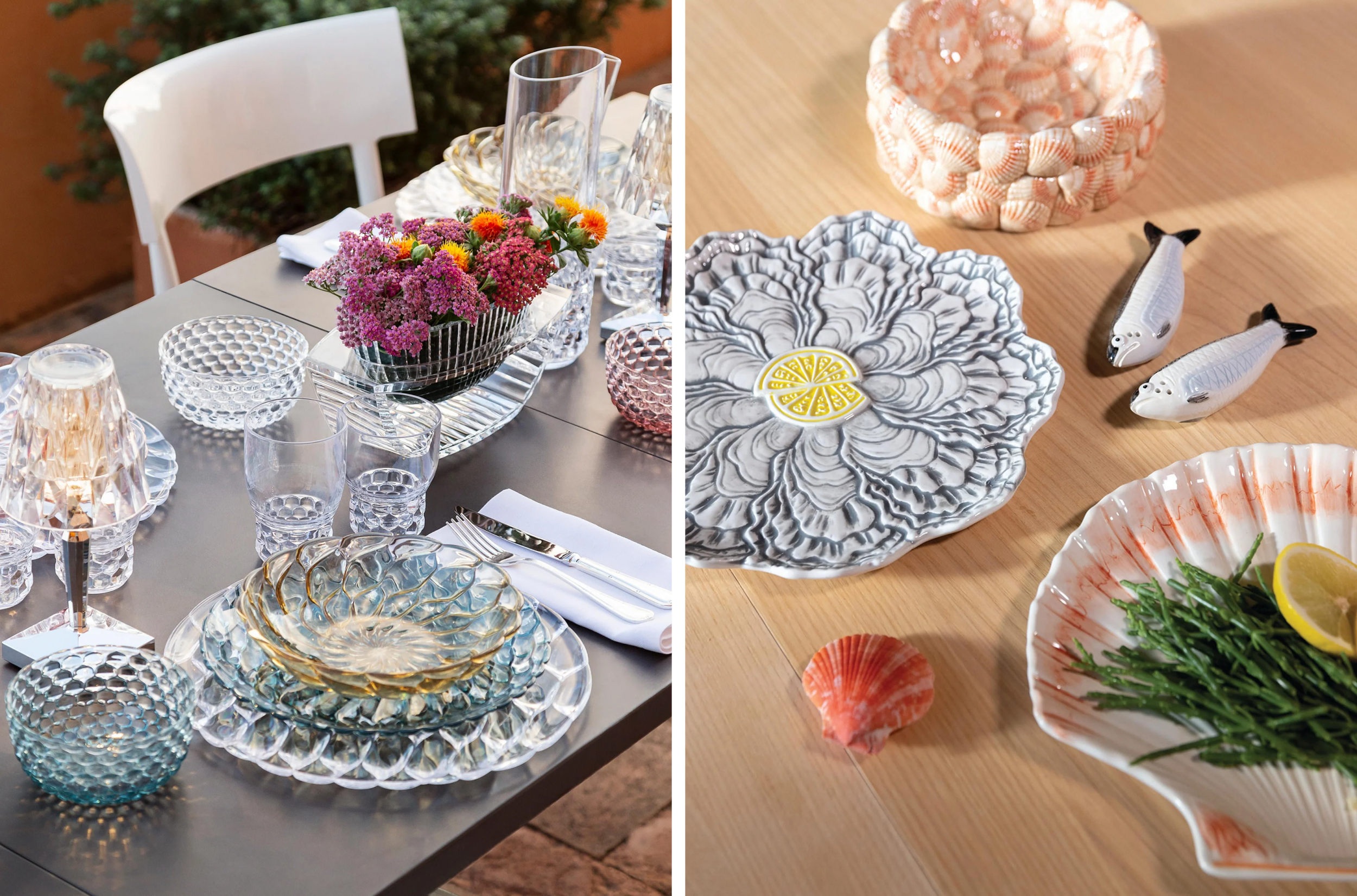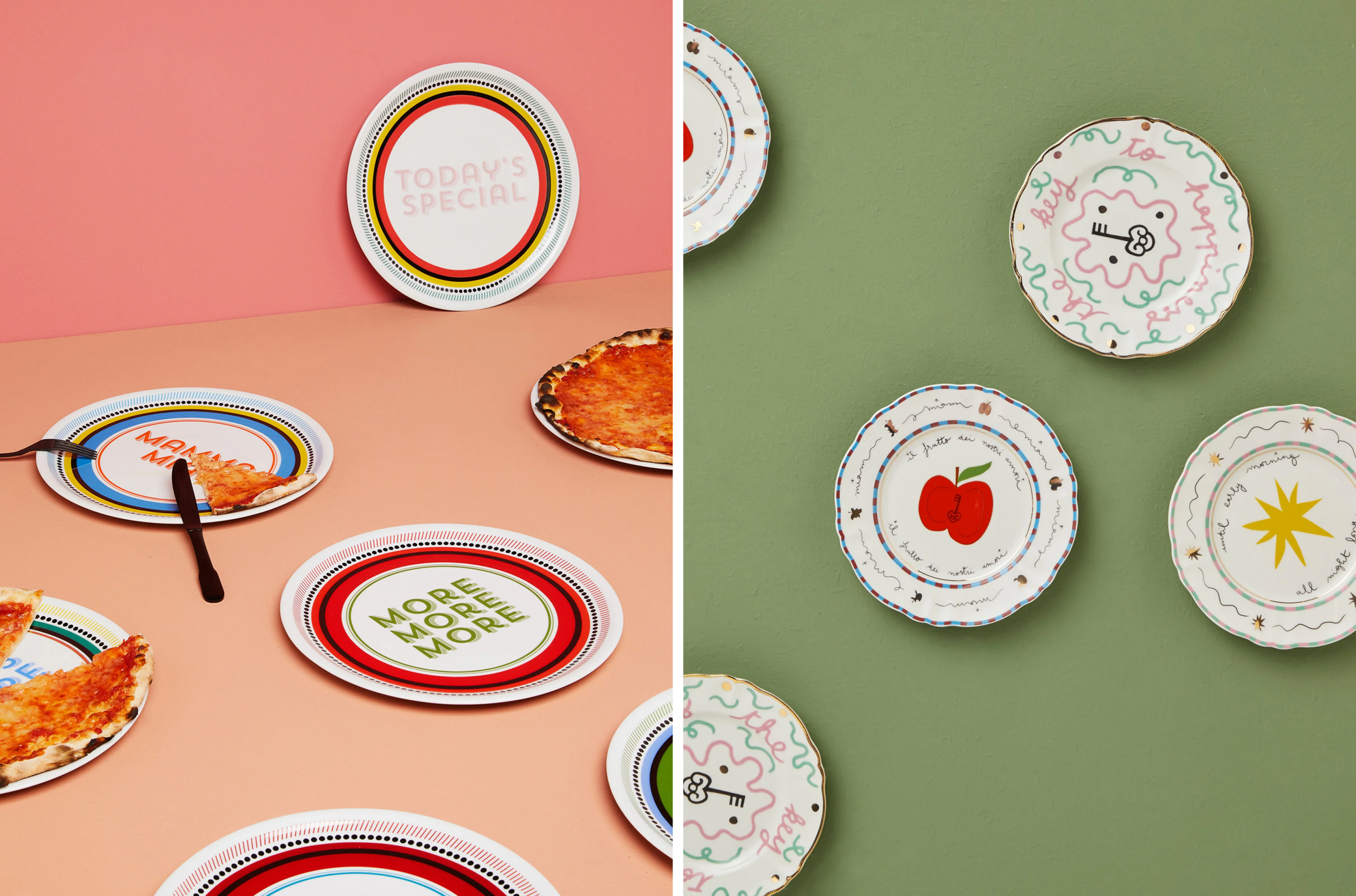 Az olasz teríték energikus, színes és játékos. Modern, figuratív minták, kézzel festett tányérok és tálak, élénk árnyalatok és merész kombinációk határozzák meg. Az olasz asztal nem a formalitásról, hanem a közösségről szól: nagy tálak, megosztható fogások, családias hangulat.