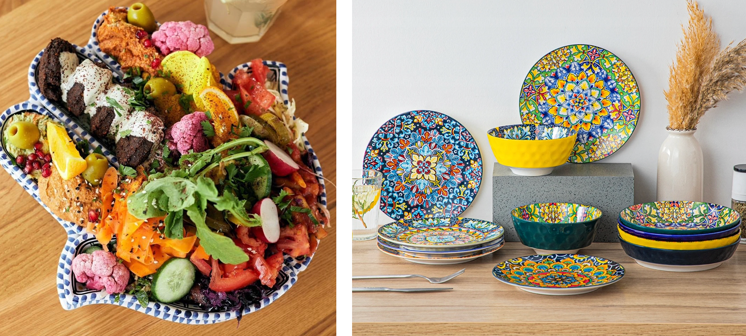 A marokkói teríték gazdag színvilága és ornamentális mintái az észak-afrikai kézműves hagyományokból táplálkoznak. Mázas kerámiák, kézzel festett tálak, fém lámpások és fűszerekben gazdag kiegészítők teremtik meg a hangulatot.