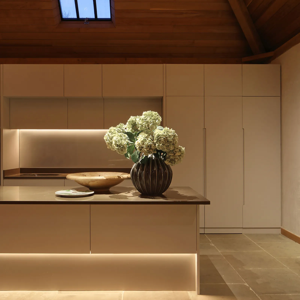 Az alacsony feszültségű, energiatakarékos LED-csíkok biztonságosan és egyszerűen világítják meg a szekrények belsejét, vagy emelik ki a nyitott polcokat. Az otthonos hangulat érdekében célszerű meleg fényt kibocsátó LED-eket választani – ehhez a Kelvin skála szerint 2500-3000 K közötti, például 2700 K körüli érték az ideális.