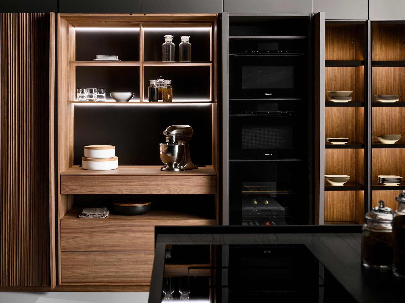 Az intelligens belső rendszerek, a magas minőségű vasalatok és a rejtett funkcionalitás természetesen integrálódnak a bútorstruktúrába. A praktikum nem külön technikai rétegként jelenik meg, hanem a design szerves részeként.