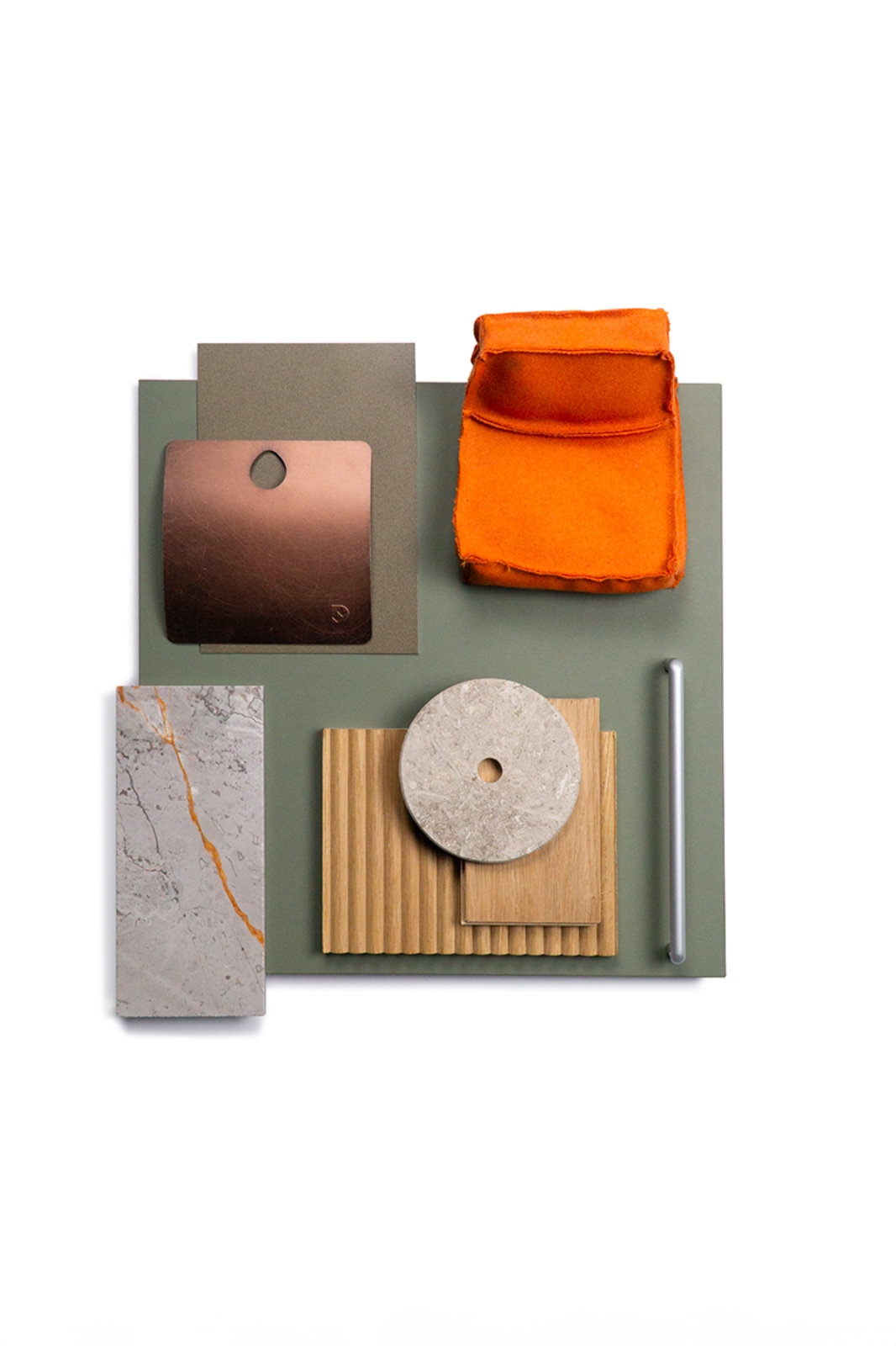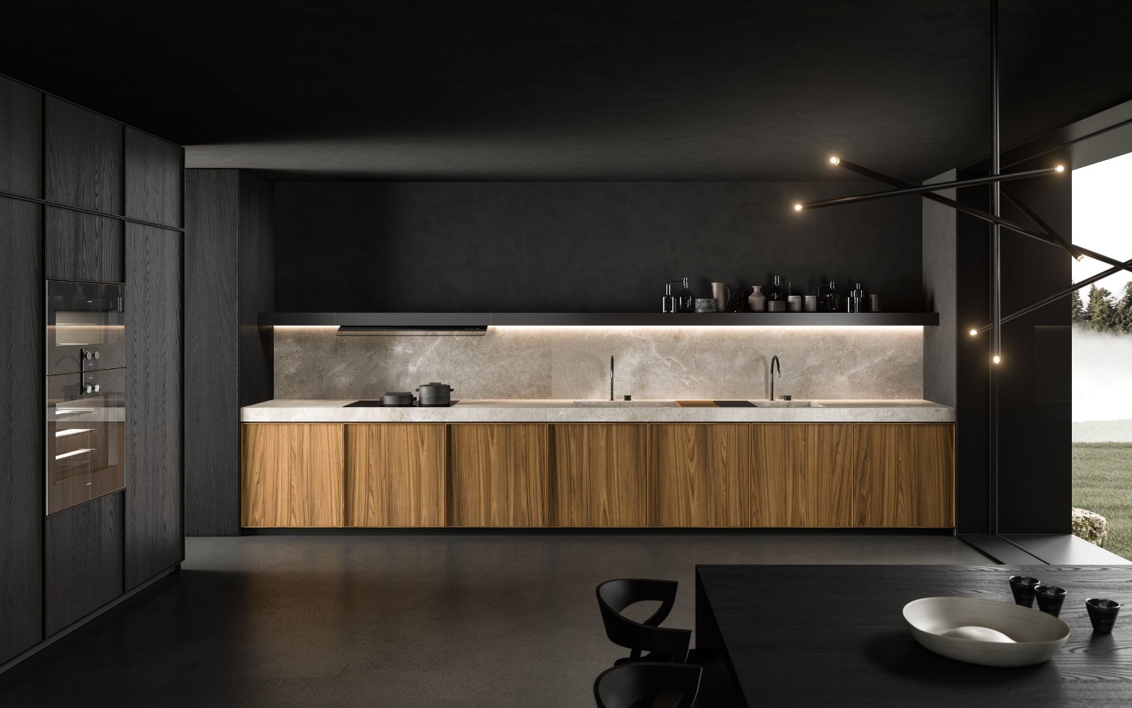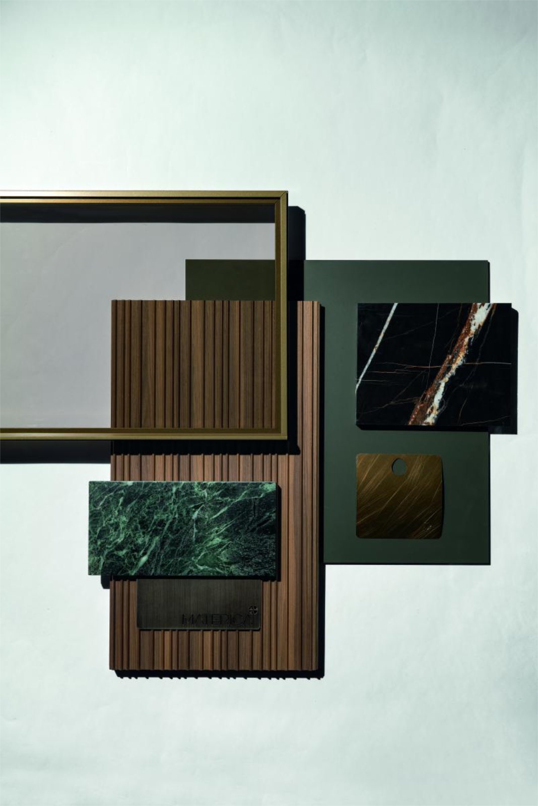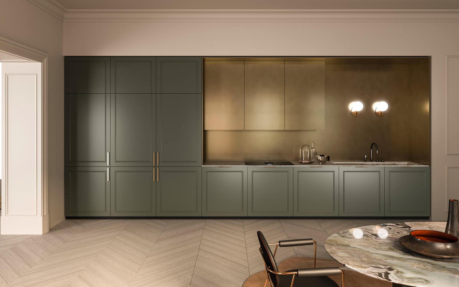 Az anyaghasználat itt egységes, természet inspirálta rendszert alkot. A selyemszatén felületek finom fénytörése elegáns, mégis visszafogott jelenlétet biztosít, miközben a militari zöld árnyalat stabil, karakteres alapot ad a kompozíciónak. Ezt ellensúlyozza a natúr tölgy furnér melegsége és valódi faérzete, amely organikus réteget visz a térbe. A munkafelületeken megjelenő Technistone Glencoe márványhatású technikai kő a klasszikus márvány esztétikáját ötvözi a kortárs műszaki teljesítménnyel: magas kopásállóság, tartósság és következetes minőség társul a kifinomult megjelenéshez.