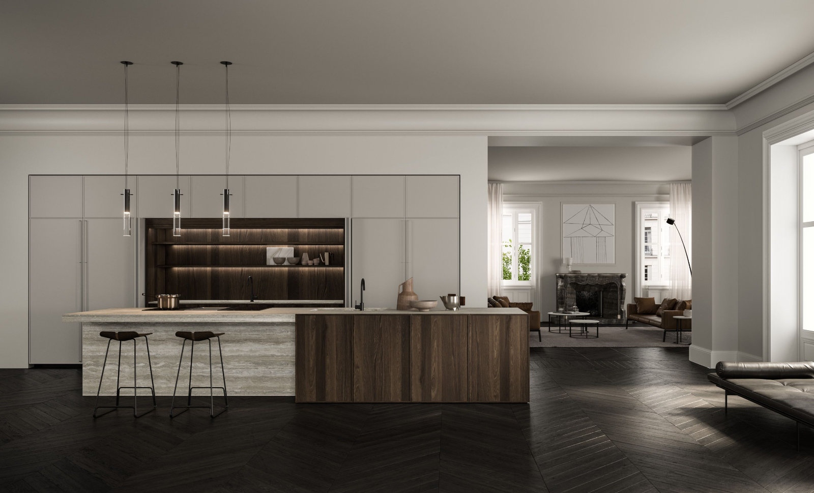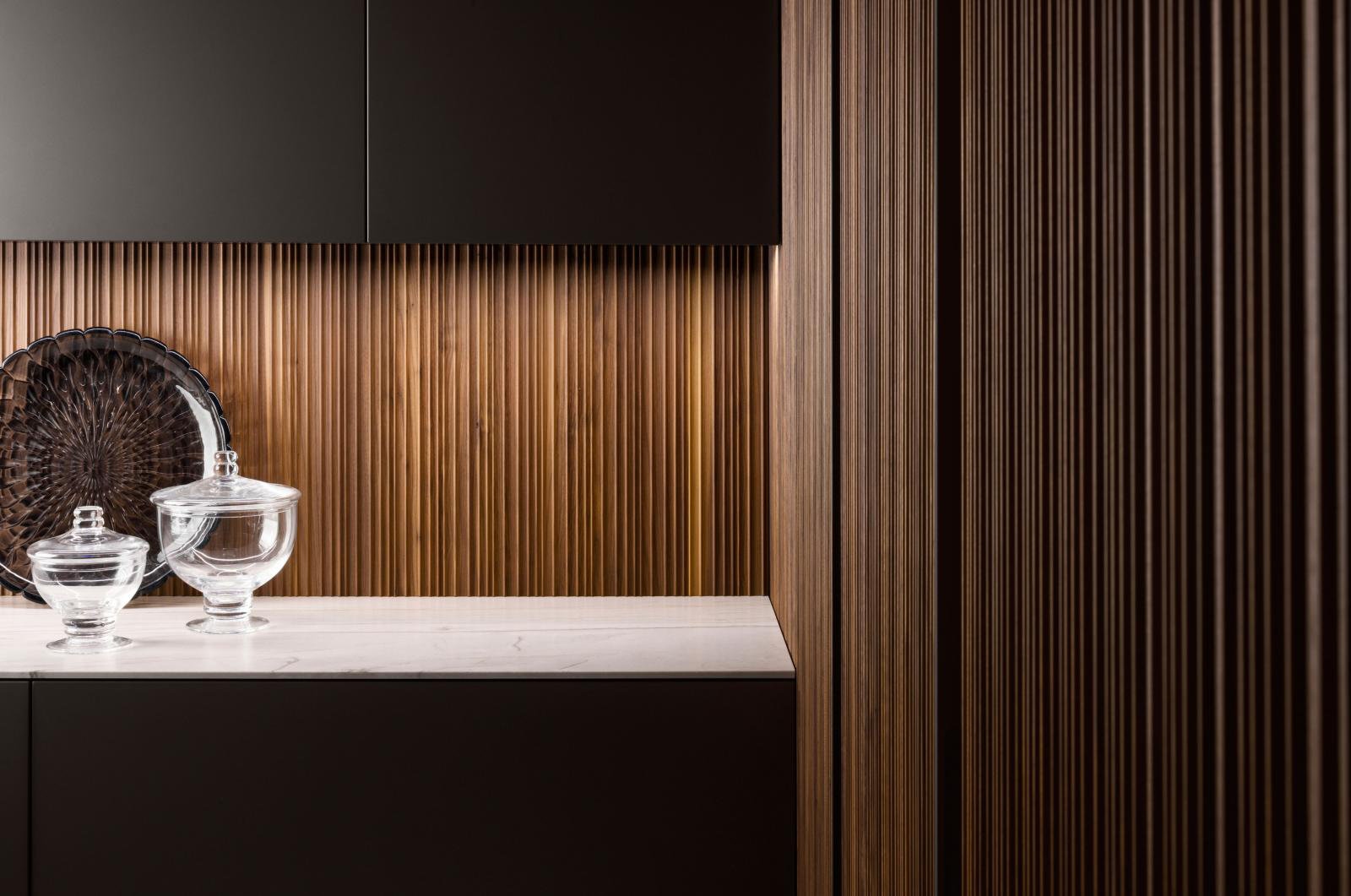 A bemutatott enteriőr formavilága letisztult, arányrendszere tudatosan szerkesztett. A hangsúly nem a látványos formai gesztusokon, hanem a részletek finom minőségén van: a felületek találkozásán, a frontkialakítás karakterén, az illesztések precizitásán. A harmónia itt konstrukciós kérdés.
